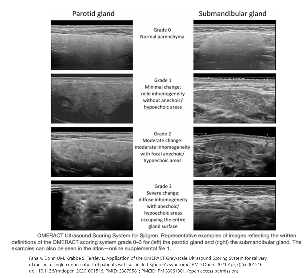 Fana V, Dohn UM, Krabbe S, Terslev L. Application of the OMERACT Grey-scale Ultrasound Scoring System for salivary glands in a single-centre cohort of patients with suspected Sjögren's syndrome. RMD Open. 2021 Apr;7(2):e001516. doi: 10.1136/rmdopen-2020-001516. PMID: 33879581; PMCID: PMC8061801.